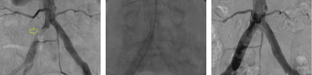 Iliac Artery Angioplasty & Stent: Heavily calcified & stenosed Iliac artery on pre-treatment angiogram [left]. Balloon angioplasty prior to stent placement [centre]. After successful stent deployment [right]